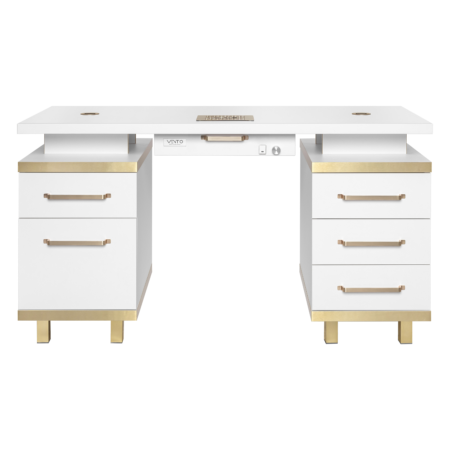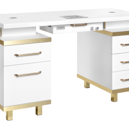 Biurko Black Caviar by Aleksandra Sowa-Falarz to połączenie lakierowanych  powierzchni w kolorze czarnym – ze złotymi uchwytami oraz najmodniejszymi nóżkami. Dodatkowym atutem jest elegancka maskownica pochłaniacza od strony stylisty jak i klientki.
